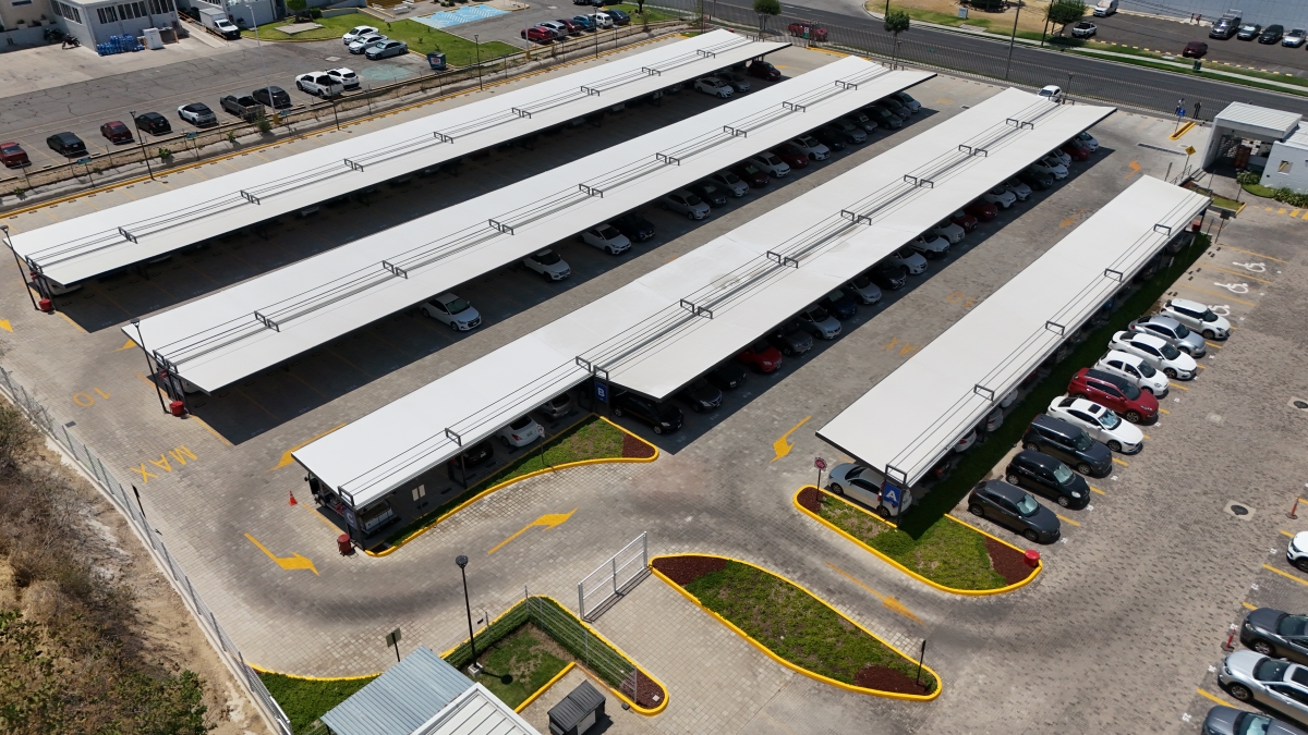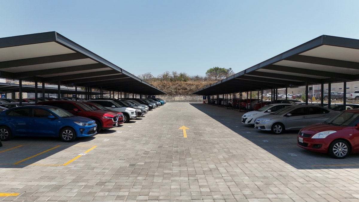 Para este proyecto se planteó la necesidad de diseñar y construir un estacionamiento completamente funcional y equipado, sobre un terreno baldío que se usaba anteriormente para estacionamiento provisional; En esta área se proyectó un diseño de módulo de techado con Lona impermeable en color blanco y una estructura metálica en color gris que contrastara con los tonos claros del techado.